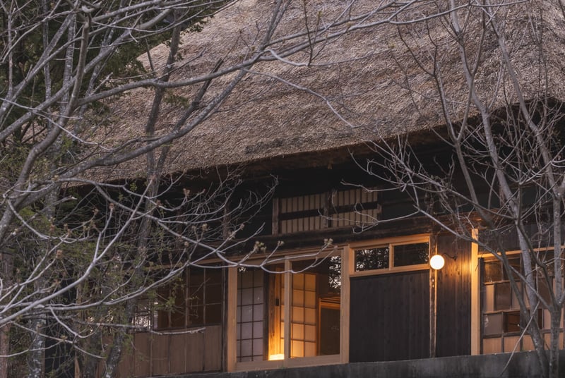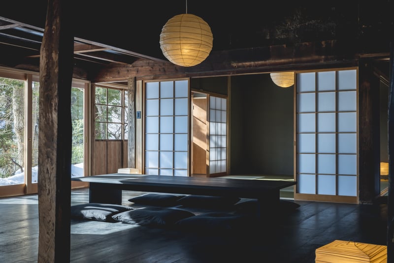 In the central area of Togakushi, Awai Togakushi has renovated two buildings into elegant, minimalist accommodations for guests looking to get away. The first is the old town hall, which has two double rooms on the second floor and a dining area on the first. The second is a thatched roof kominka house with two tatami rooms, an engawa balcony, living room kitchen, bathroom and dining room. It can sleep up to 6 people. The large windows look into the woods of Togakushi and let in plenty of natural light.