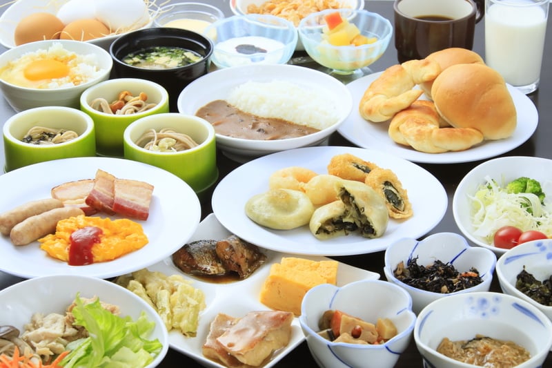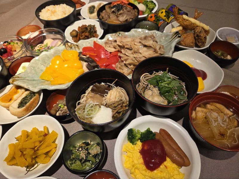 A range of foods for breakfast including Nagano specialties such as oyaki and soba noodles