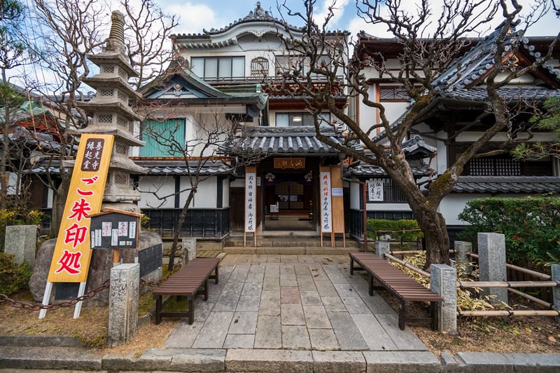 Matsuya Ryokan stands behind the Enmei Jizo statue, which commemorates the former location of Zenkoji Temple