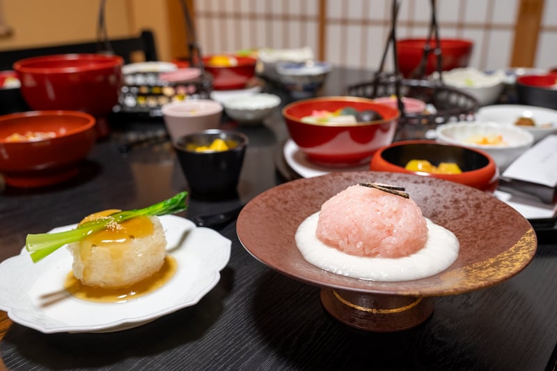 The lodge’s cuisine is prepared by the proprietress's husband, a Shinto priest, in the yama kaiseki style. These traditional multi-course Japanese meals feature historical condiments, unique flavorings, handmade soba and homemade miso—fit for even an offering to Shinto deities. Indeed, the meals are first offered to the deities before being eaten by the shukubo's guests. Known as shinjin kyoshoku, this practice strengthens the bond between deity and participant, granting the latter protection and vitality.