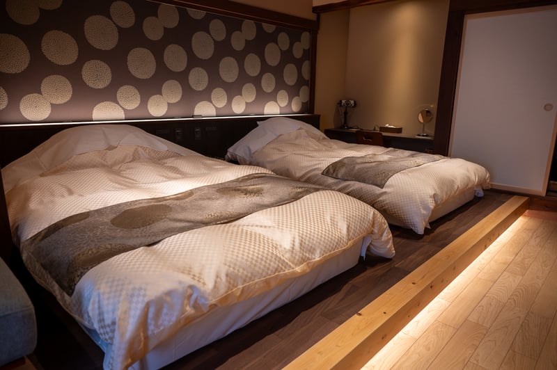 A comfortable, Japanese modern bedroom with twin beds in one of its renovated rooms