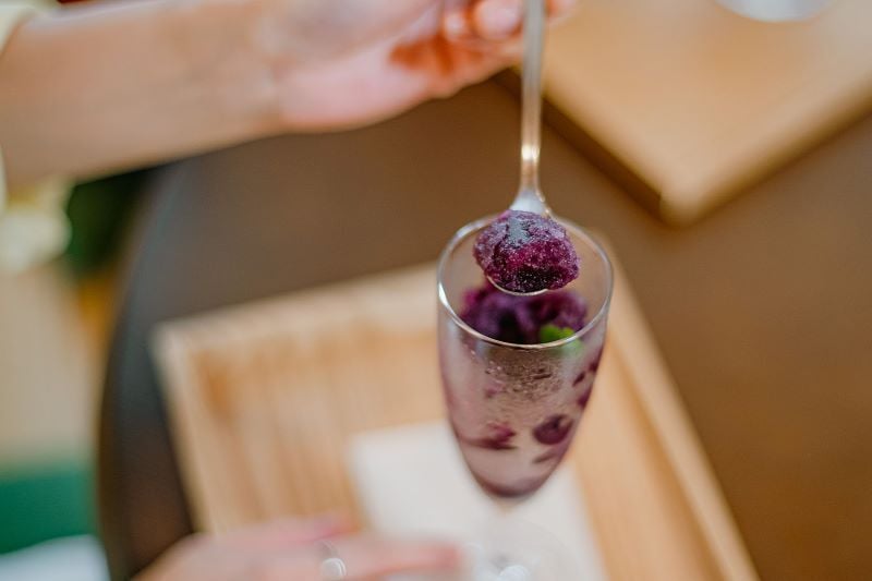 「カネ十農園」の100%巨峰ジュースをシャーベットにした「巨峰のグラニテ」(400円)
