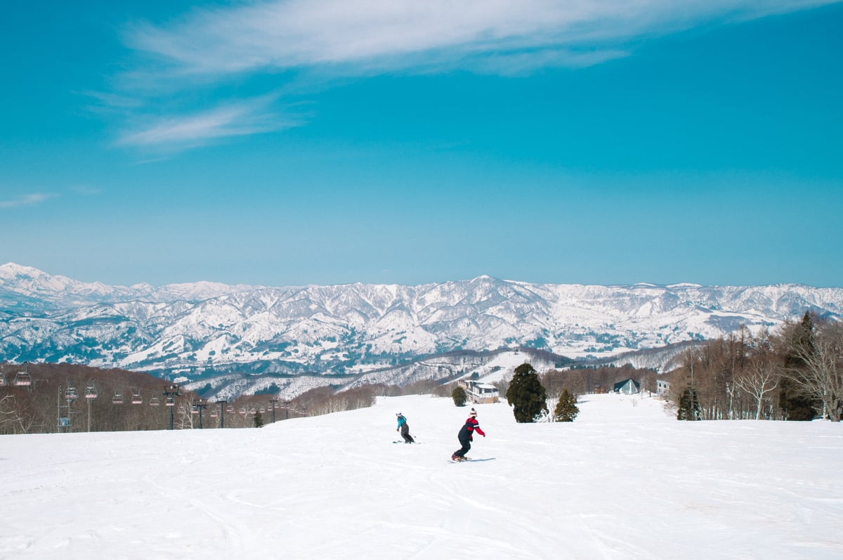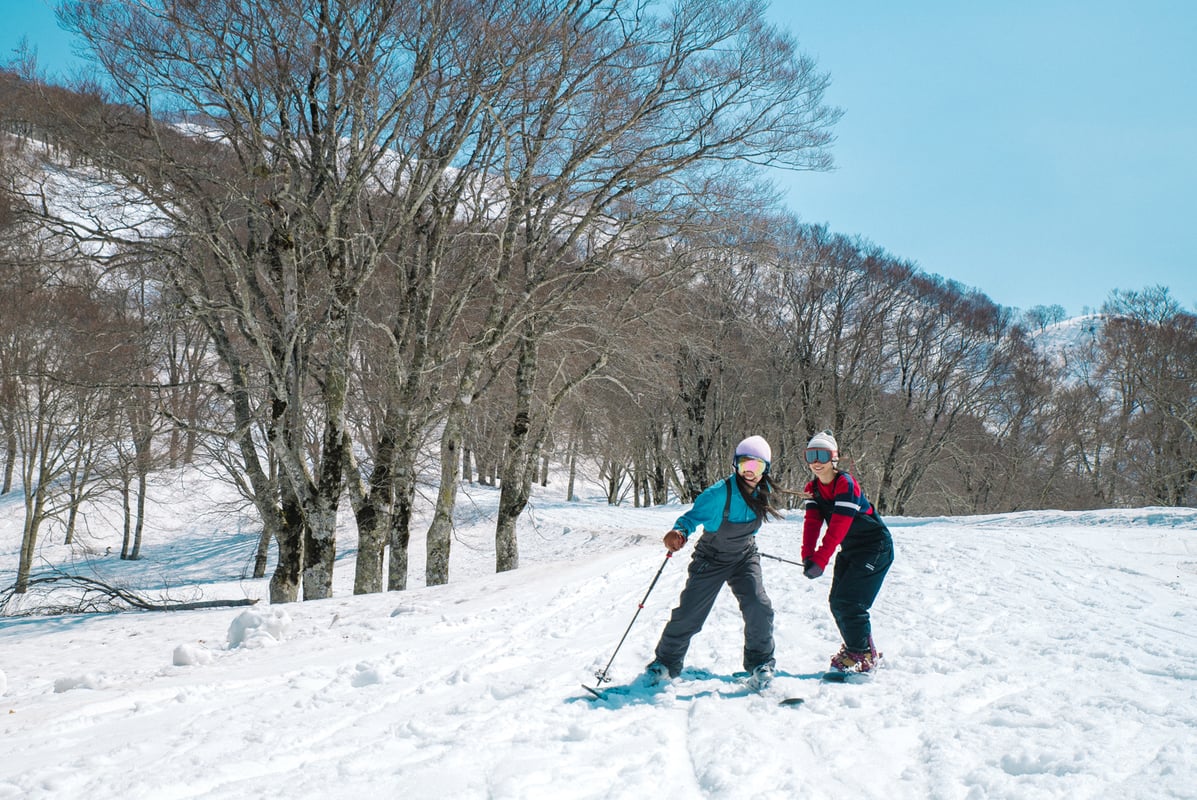 今度は山頂から山麓部まで一気に滑り降ります。途中、上ノ平ゲレンデやパラダイスゲレンデは、斜度が緩やかで初心者にもおすすめ。徐々に気温も上がり、暑いくらいの陽気も、広い空を仰ぎながら風を切って滑る気持ちよさは「最高!」の一言。