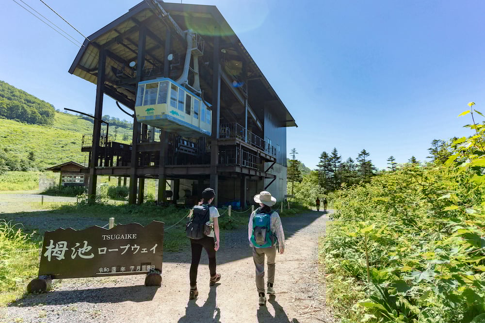 栂池自然園には、麓の栂池高原からゴンドラリフトとロープウェイを乗り継いで行く。ゴンドラリフトの山頂駅「栂の森駅」までは約20分ほど。子どもと3人、検温と手の消毒を済ませてから乗車チケットを購入し、乗り場へと向かった。感染症対策が丁寧に行われていることに安心感がある。 ゴンドラの中間駅を通り過ぎ、更に登っていくと北アルプスの山並みが見えてきた。白馬岳、杓子岳、白馬鑓ヶ岳、唐松岳、その奥には五竜岳、鹿島槍ヶ岳、爺ヶ岳が並んでいく。迫力ある景色が近づくと、子どもたちの目も丸くなった。なんて良い朝の景色。早起きの十分なご褒美をもらえた。 「栂の森駅」を降り、ロープウェイに乗り換える。ロープウェイは見上げるほどの木の上を通り過ぎてゆく。約5分の空中散歩だ。麓からは遠くに見えていた山々がいよいよ近づいてくる。やがて山頂駅に着くと、自然園の入り口まではもうすぐ。