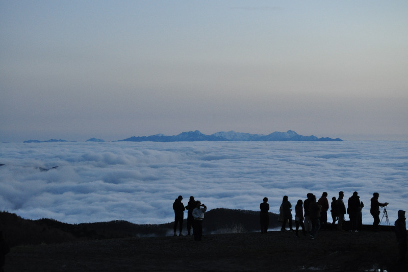 高ボッチ高原は、標高約1,600mに広がる高原です。諏訪湖と富士山の両方を一望できる日本屈指の絶景スポットとして知られ、10月中旬から、冬季道路閉鎖(12月上旬~4月下旬)までの朝方、非常に高い確率で雲海が発生します。おすすめは日の出30分前から日の出後30分。朝陽が昇り始める頃は、東の空が橙色のグラデーションになり赤く染まる富士山。タイミングにより、雲海の隙間から群青色の諏訪湖や夜明けの街灯を見ることができ、幻想的な世界が目の前に広がります。また、西側の穂高連峰や北アルプスも朝陽を浴び、雪をまとった山がバラ色に輝く姿と眼下に広がる雲海も格別です。