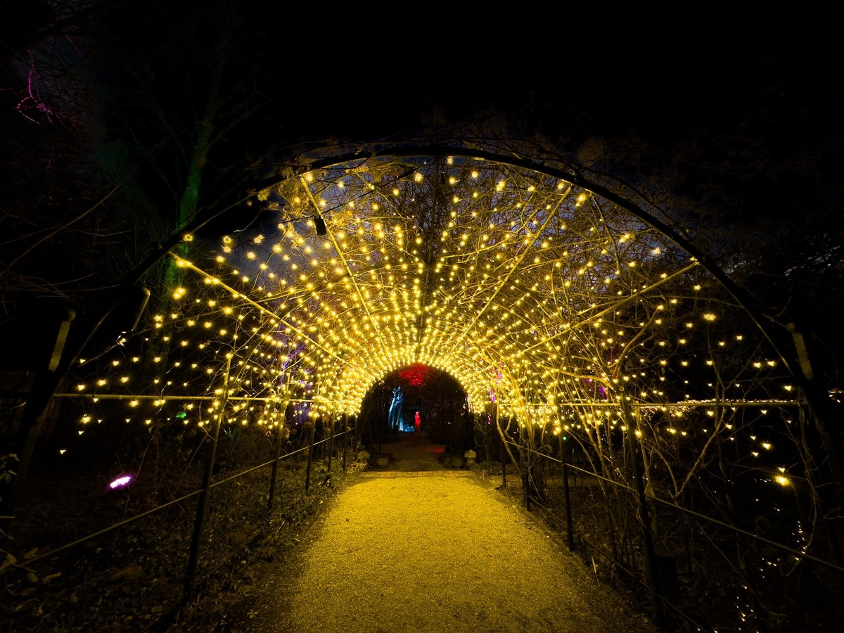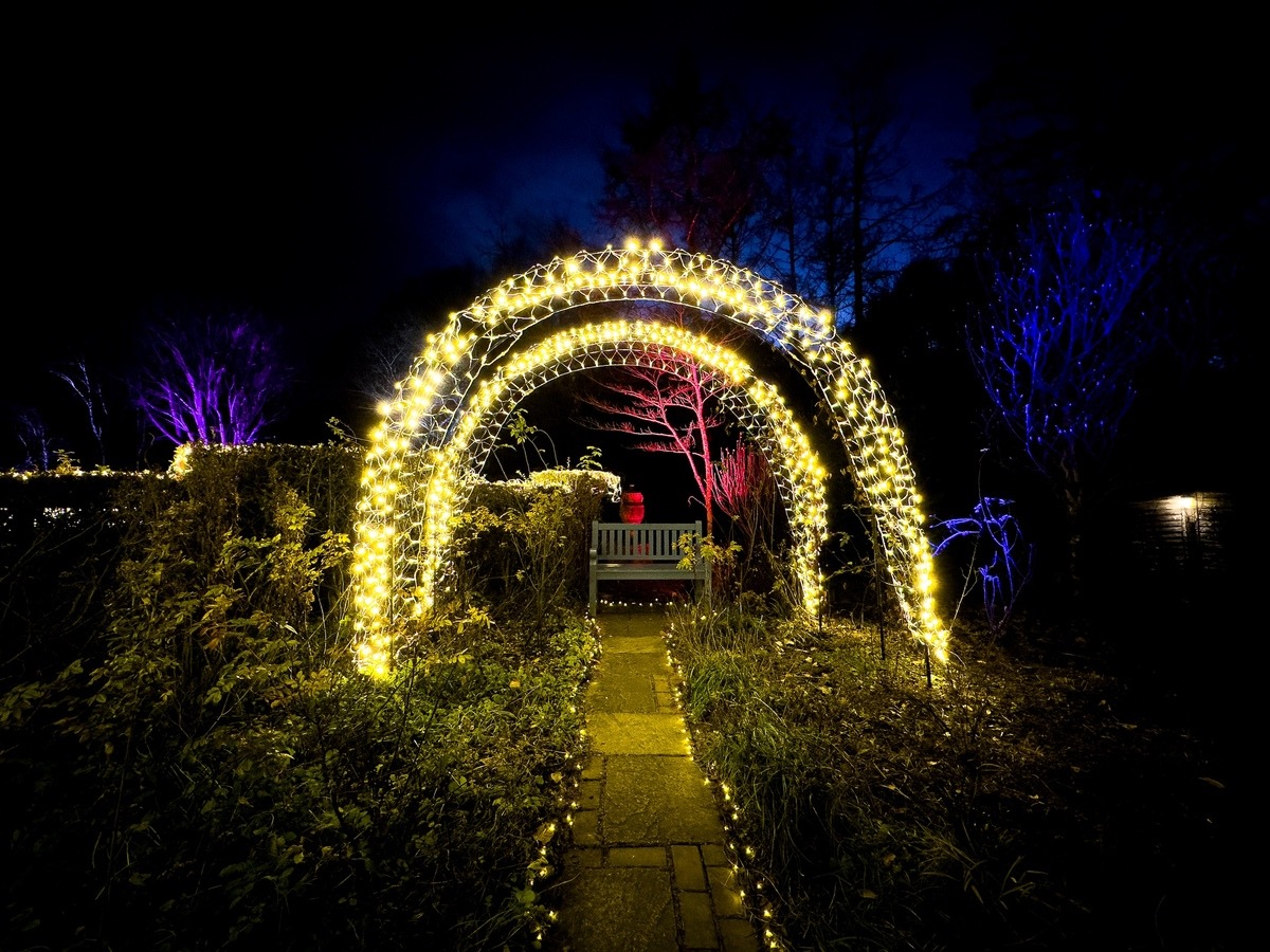 特に目を奪われたのは、庭の中央に佇む「光のアーチ」だ。パーゴラを活用したこのトンネルは、イングリッシュガーデンの象徴的存在。その美しいアーチを、温かな光が包み込む。歩みを進めると、木漏れ日のようにきらめく光が全身を優しく照らした。