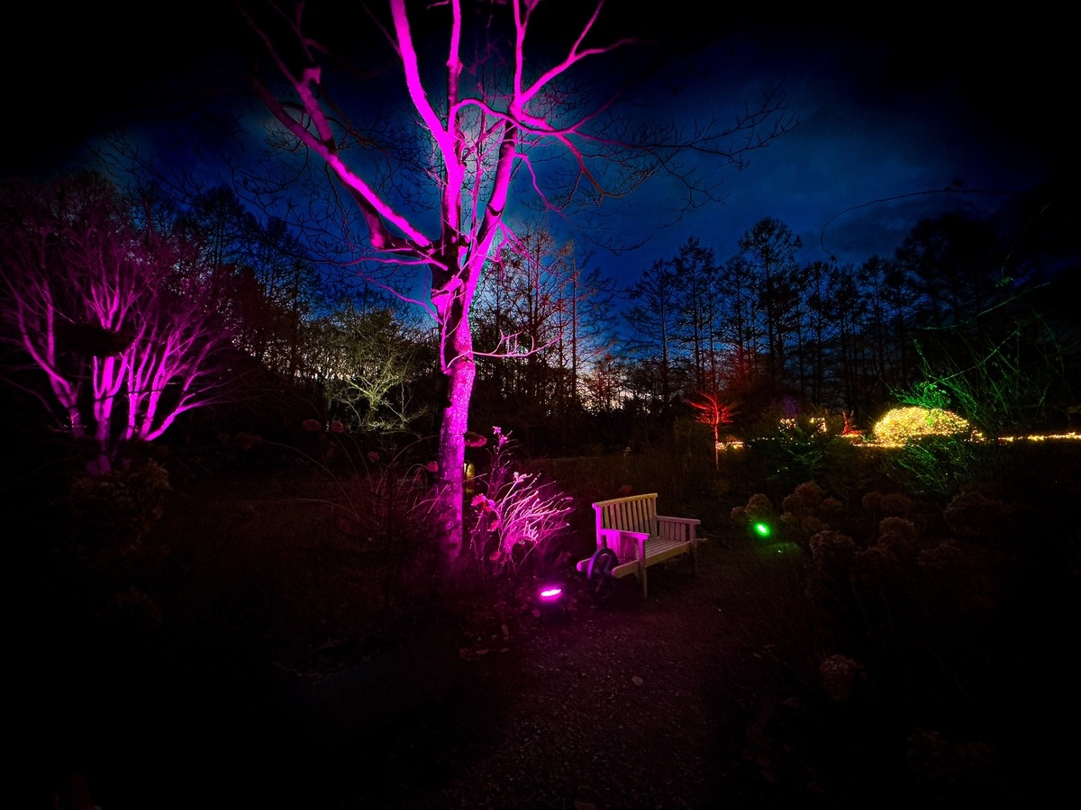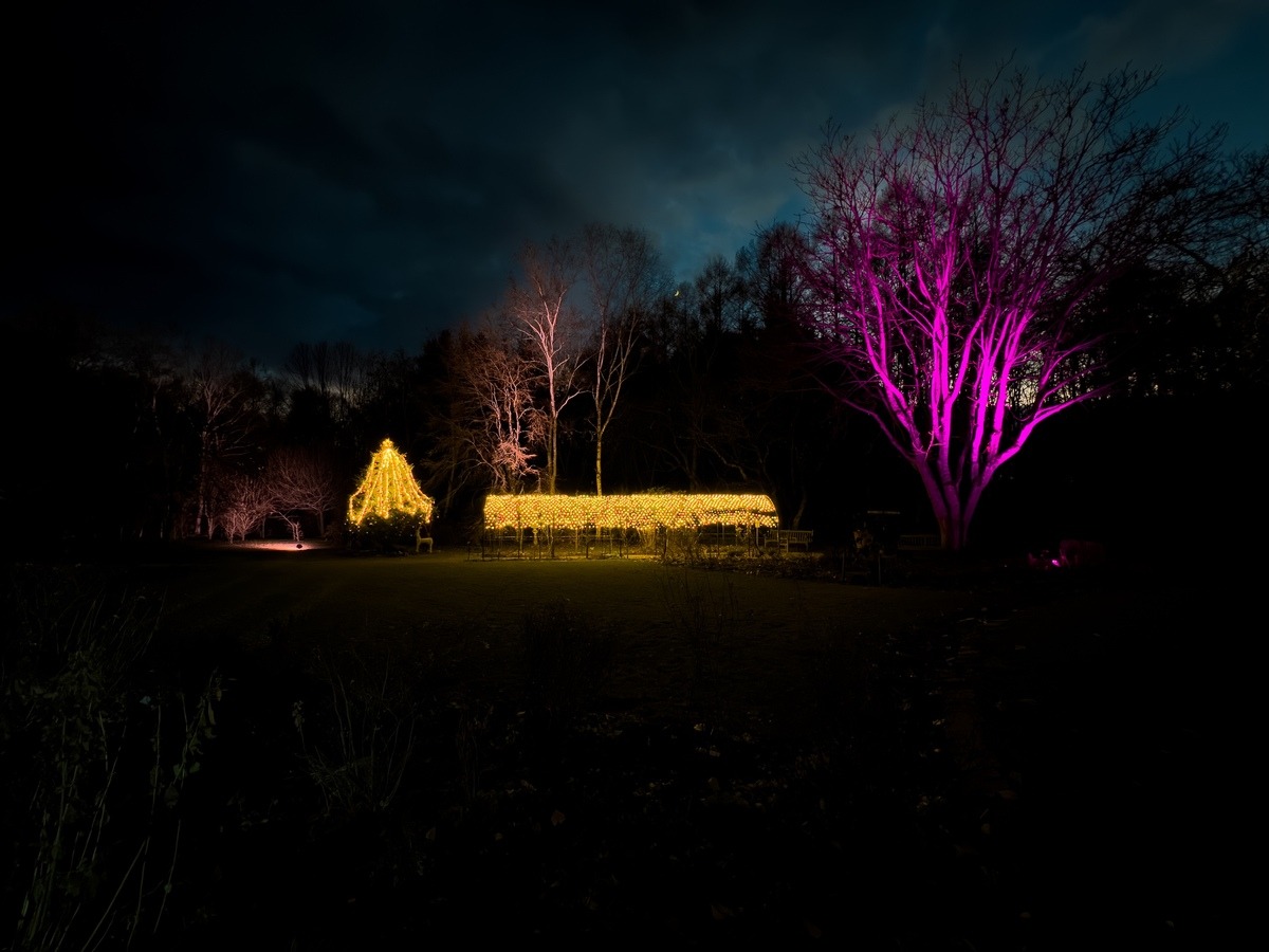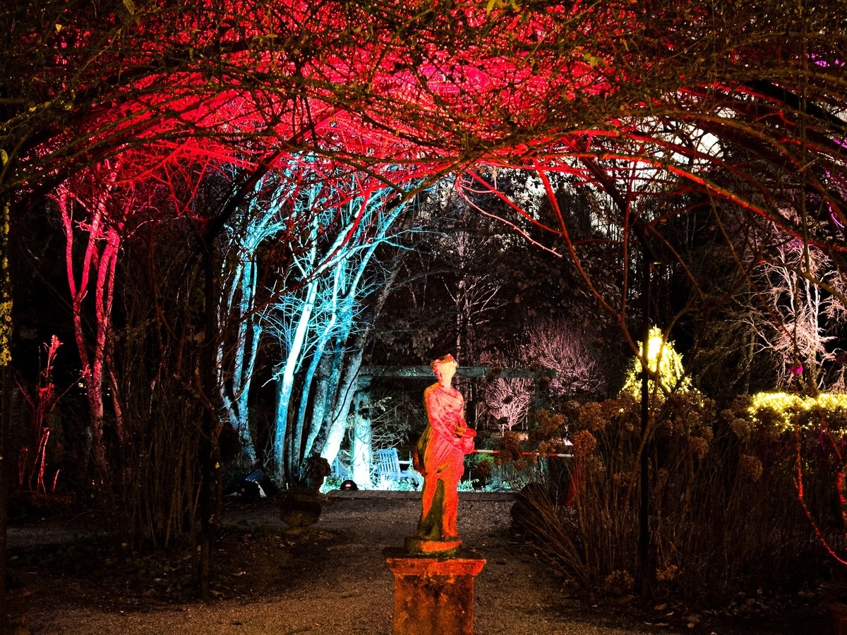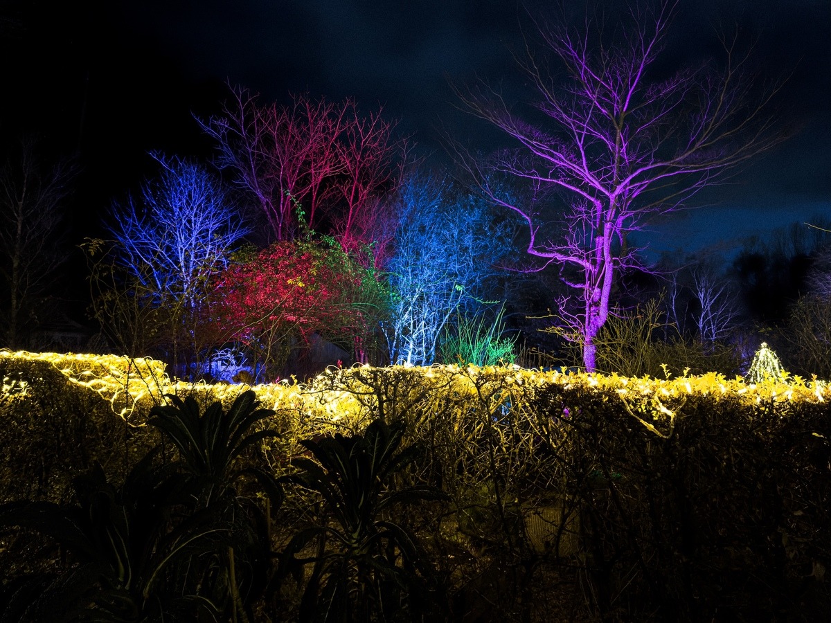 光が照らし出すのはバラクライングリッシュガーデン30年の歴史。1990年の開園時、創設者ケイ山田さん自らが選定し植樹した木々は、今や庭を雄大に覆う存在となった。カナディアンメイプル、スモークツリー、ハンカチーフツリー。植物に造詣が深いケイ山田さんが、一本一本に合わせて選んだというライトの色が、それぞれの個性を引き立てる。