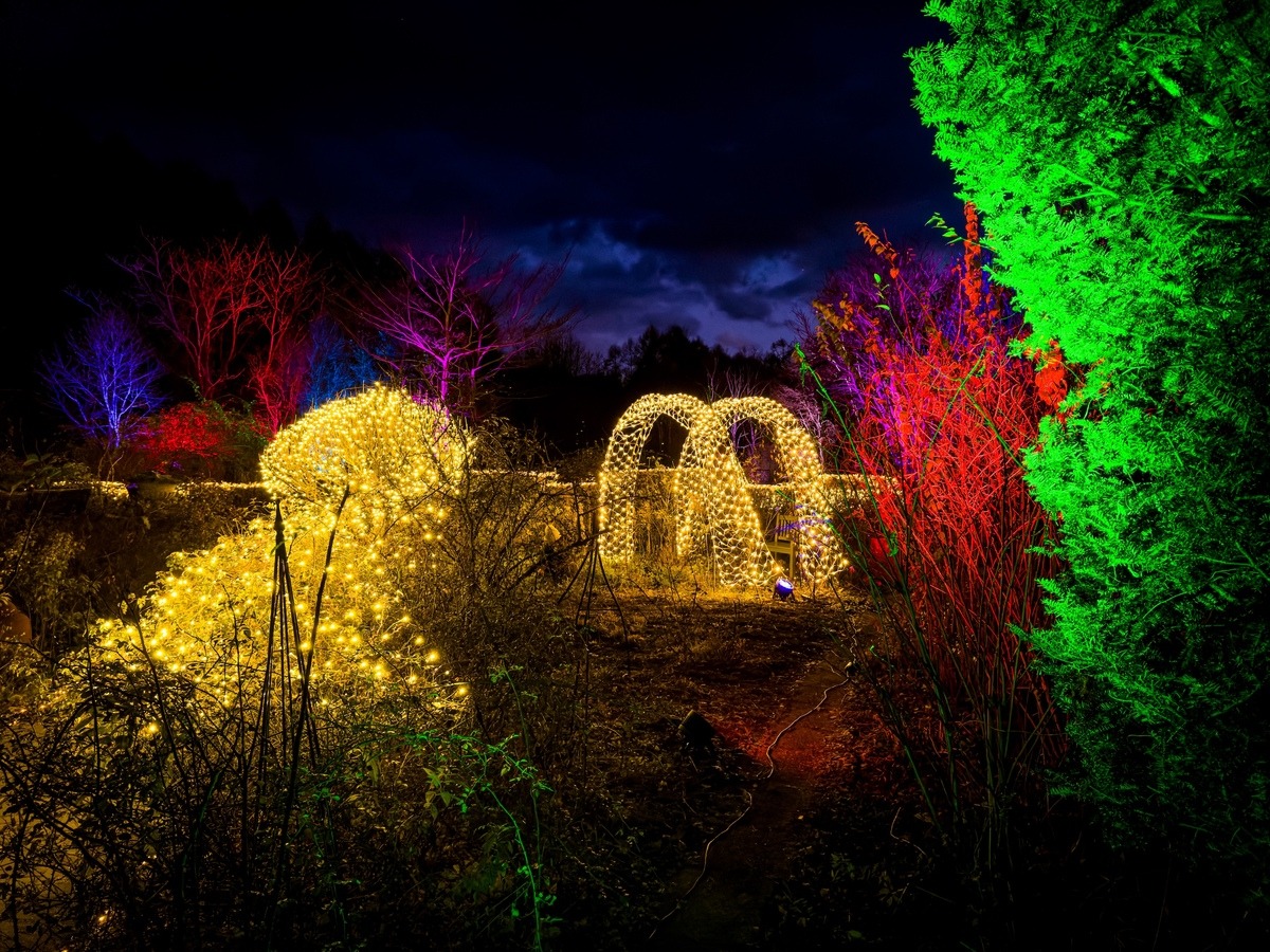 訪れた12月初旬のある夜。凛とした冷気の中、静けさに包まれた庭に足を踏み入れると、そこはもう現実とは思えない幻想的な光景が広がっていた。木々のシルエットが浮かび上がり、小道が光の粒で縁取られ、まるで絵画の中に迷い込んだかのよう。この美しさの秘密は、イングリッシュガーデンならではの庭園設計と、光の繊細な演出にある。