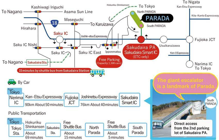 โดยรถยนต์: ขึ้นบันไดเลื่อนตรงไปยังลานสกีได้จาก “Sakudaira PA” บนทางด่วน Joshinetsu ได้เลย! (มีแค่ที่นี่ที่เดียวในญี่ปุ่น!)