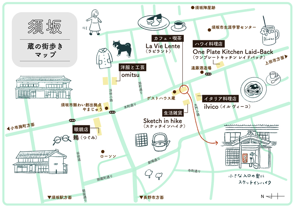 長野県の北東部に位置する須坂市は、りんごやぶどうなどの果物、米や野菜など、おいしい農産物が育つ地域です。明治から昭和初期にかけては製糸業で栄え、当時の面影を残す街並みは、「蔵の街」として大切に守られてきました。須坂市では、そうした歴史ある街並みを活かし、点在する文化財を見たり、文化に触れて学びを深めたりする「まるごと博物館構想」を進めています。ここで語られる「文化財」とは、人が生み出すつながりや交流、そこではじまる取り組みなど、目に見えない価値まで含む全てのもの。この記事では、古い街並みに溶け込むカフェや商店など、須坂市中町周辺の小道に集まる新しい文化の数々をご紹介します。